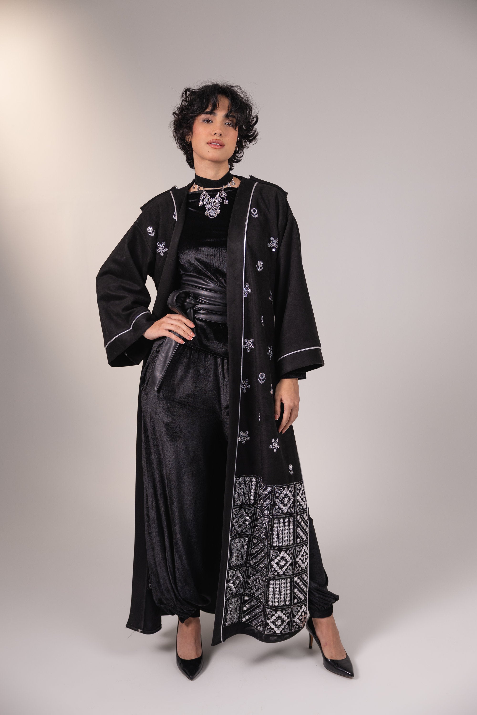 A suede kaftan created with an elegant, flowing silhouette, detailed with delicate embroidery and finished with a matching belt that offers a flattering, adjustable fit. Designed to ensure comfort while maintaining a refined and polished look.