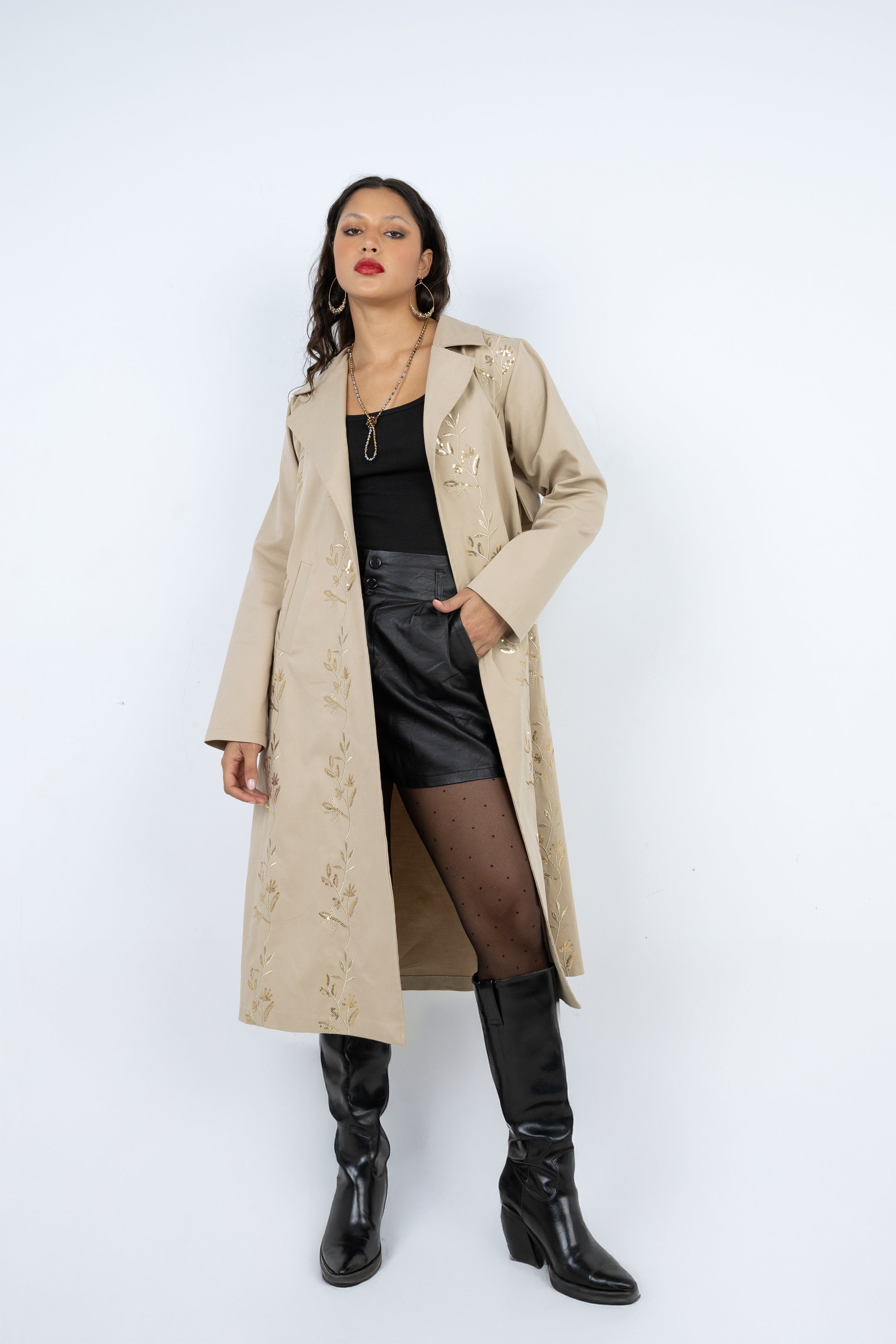 Beige Gabardine Trench Coat with Elegant Gold Embroidery ✨Step into elegance with this stunning beige gabardine trench coat,