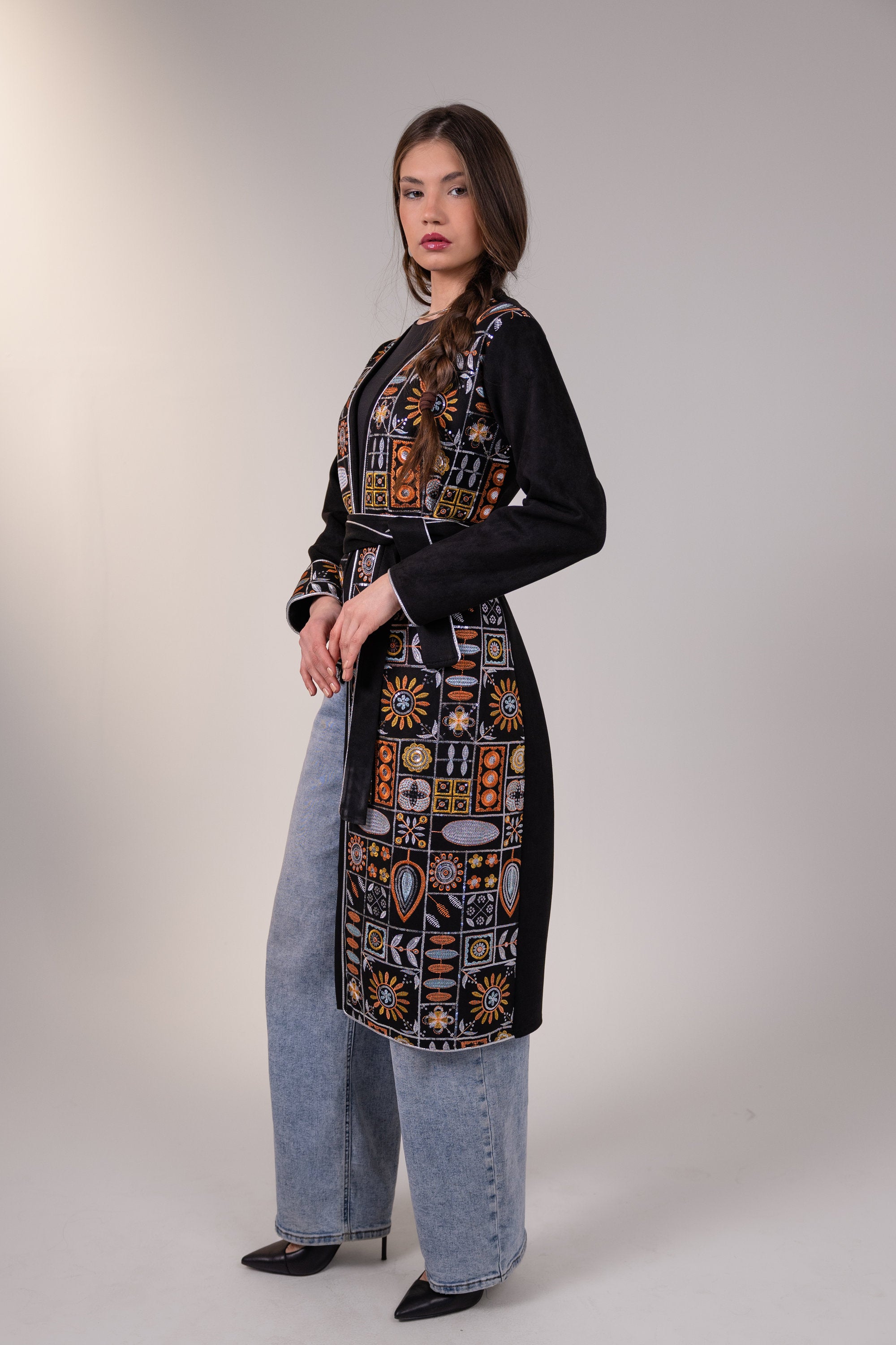 An elegant suede kaftan crafted with a fluid, refined silhouette, accented by delicate embroidery and finished with a matching belt for a flattering, adjustable fit. Designed to balance comfort with a polished and sophisticated appearance.