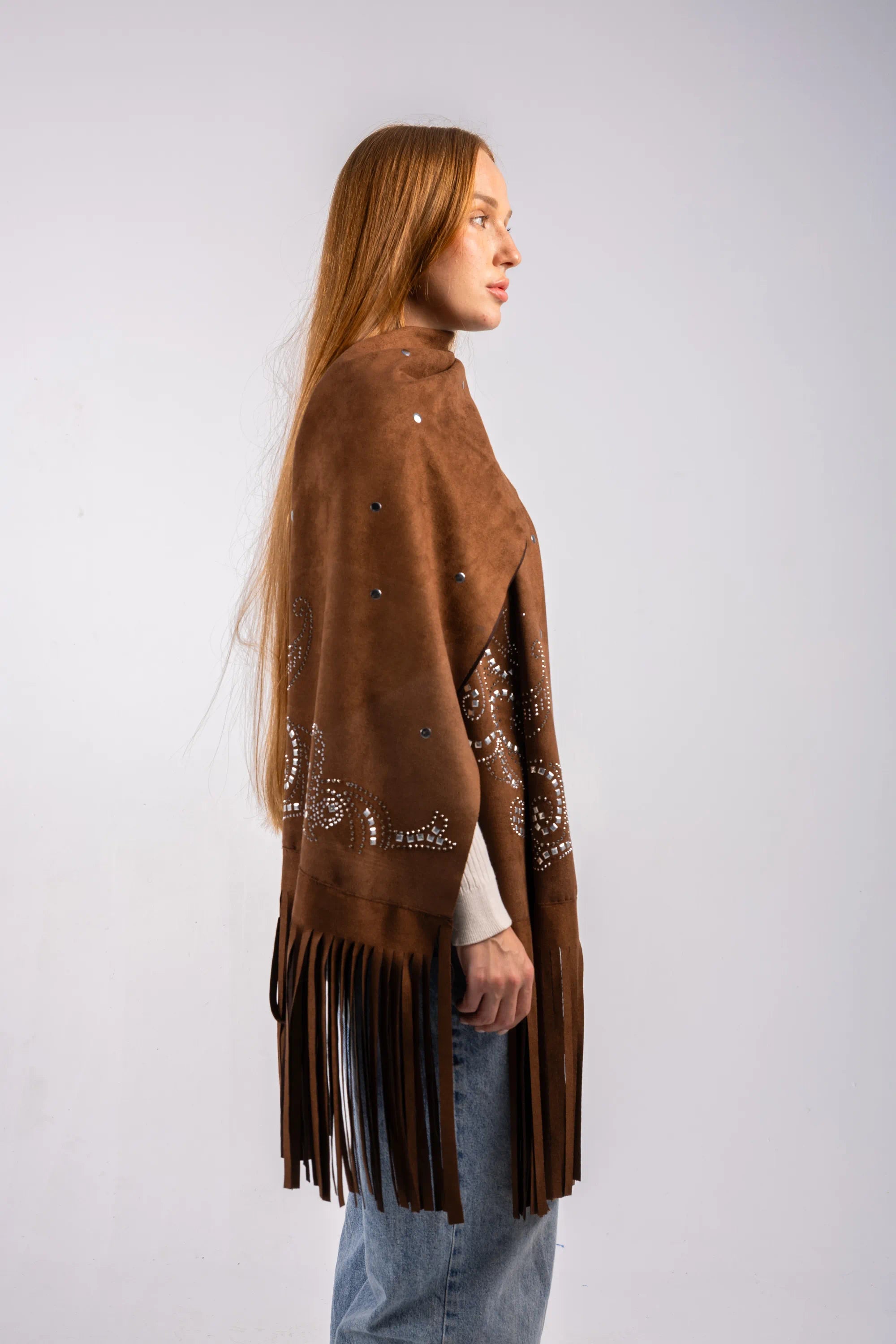 A soft suede scarf designed to elevate any outfit with ease. Its smooth texture, stylish fringes, and subtle stud detailing create a refined, modern statement. Lightweight and versatile, it drapes beautifully and adds effortless sophistication to your everyday looks.