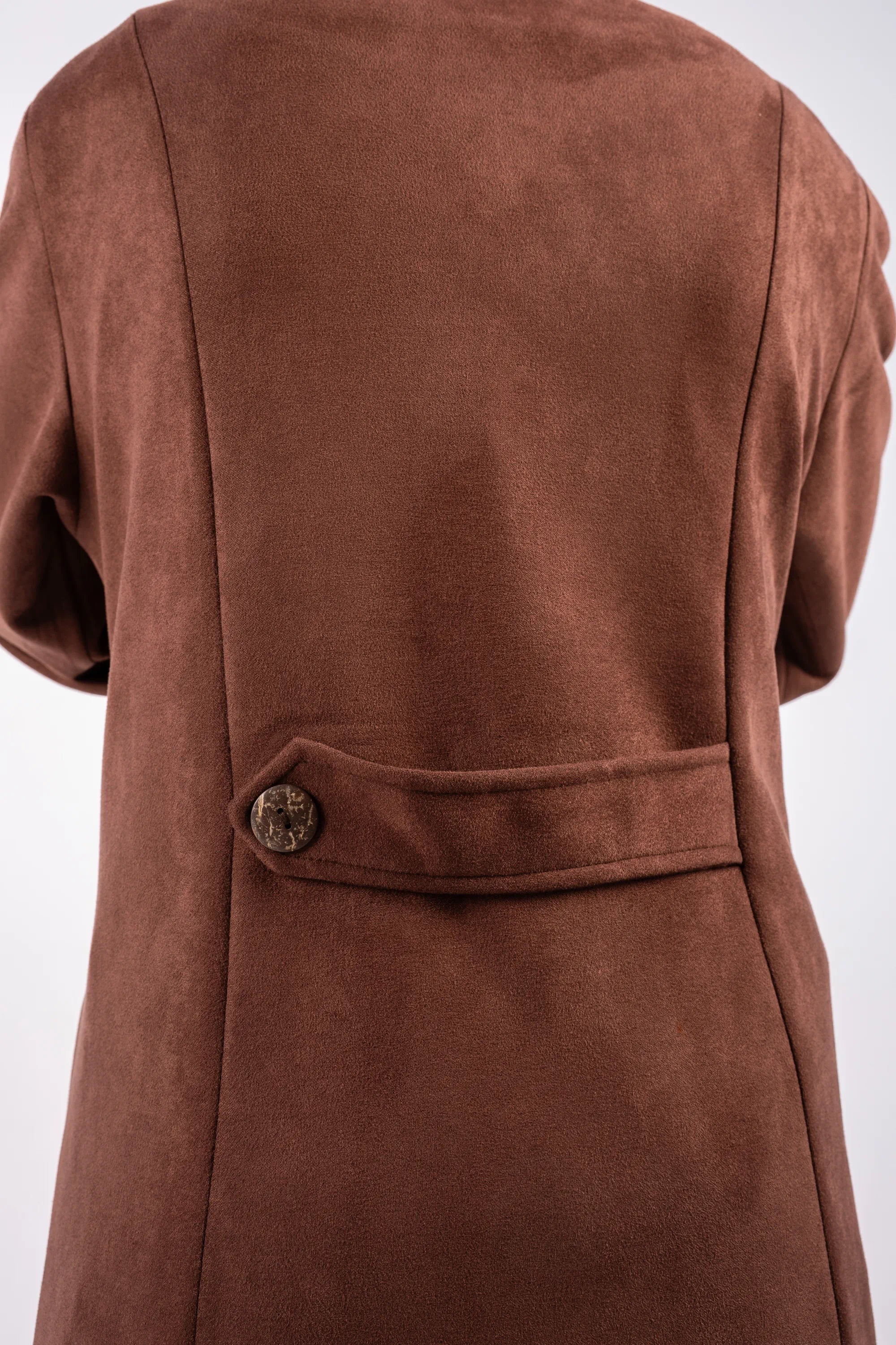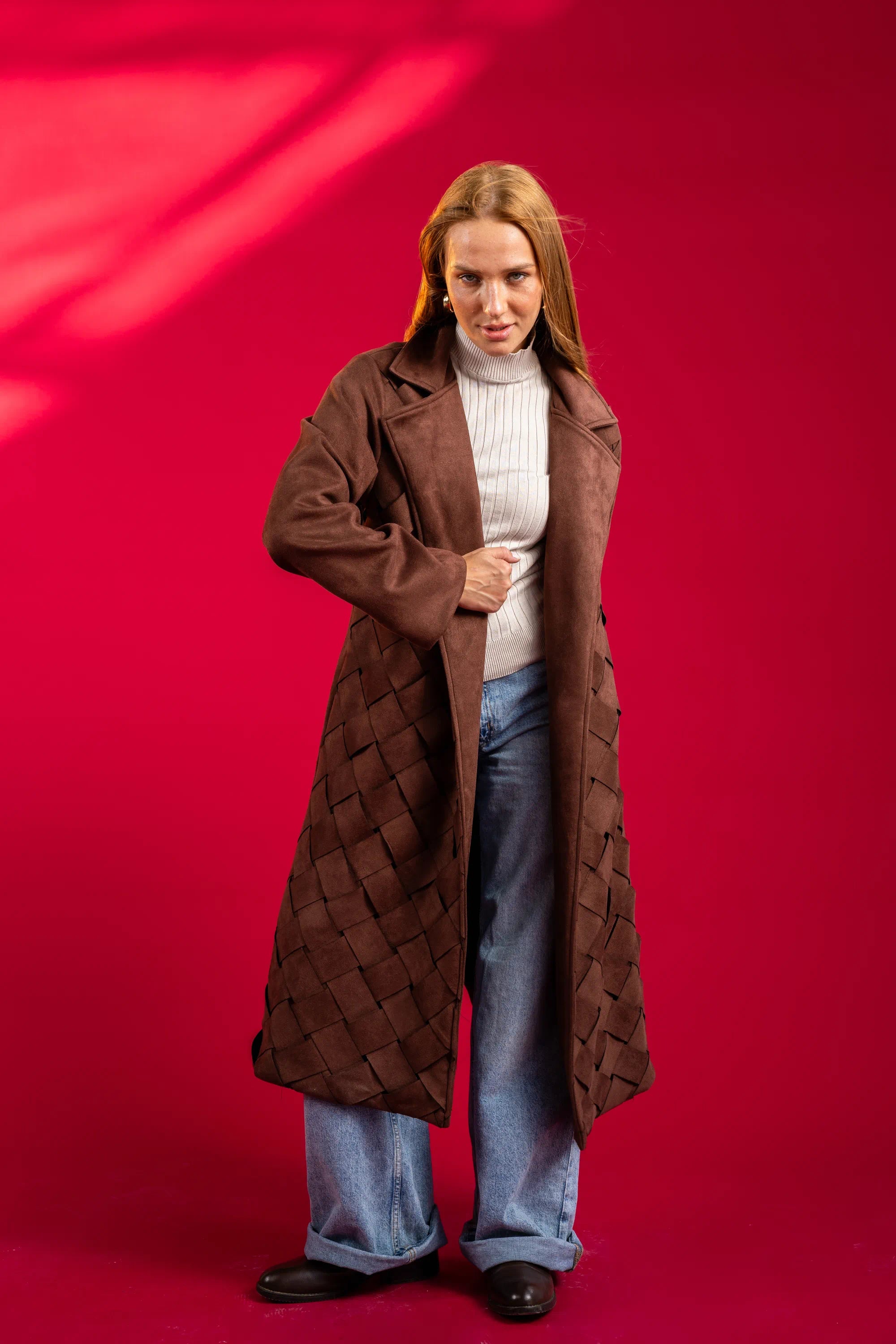 A long suede coat featuring beautifully woven side panels that add texture, depth, and refined structure to your winter look. Its clean silhouette and soft suede finish make it a versatile and elegant layering piece for colder days.