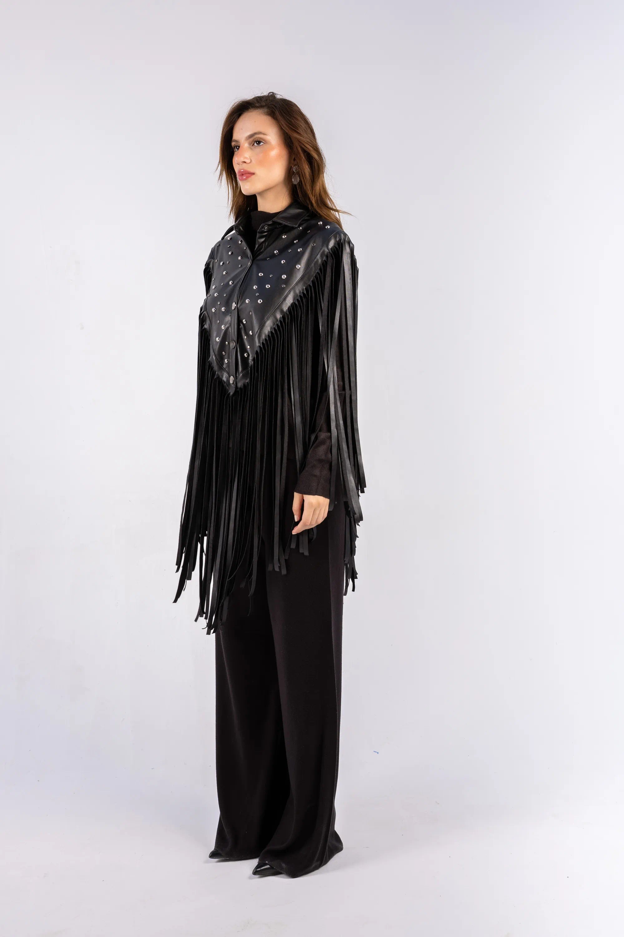 A leather scarf crafted with bold stud embellishments and cascading fringes—adding movement, structure, and a powerful statement finish. Its striking design instantly elevates any outfit, making it a standout accessory for bold, modern styling.