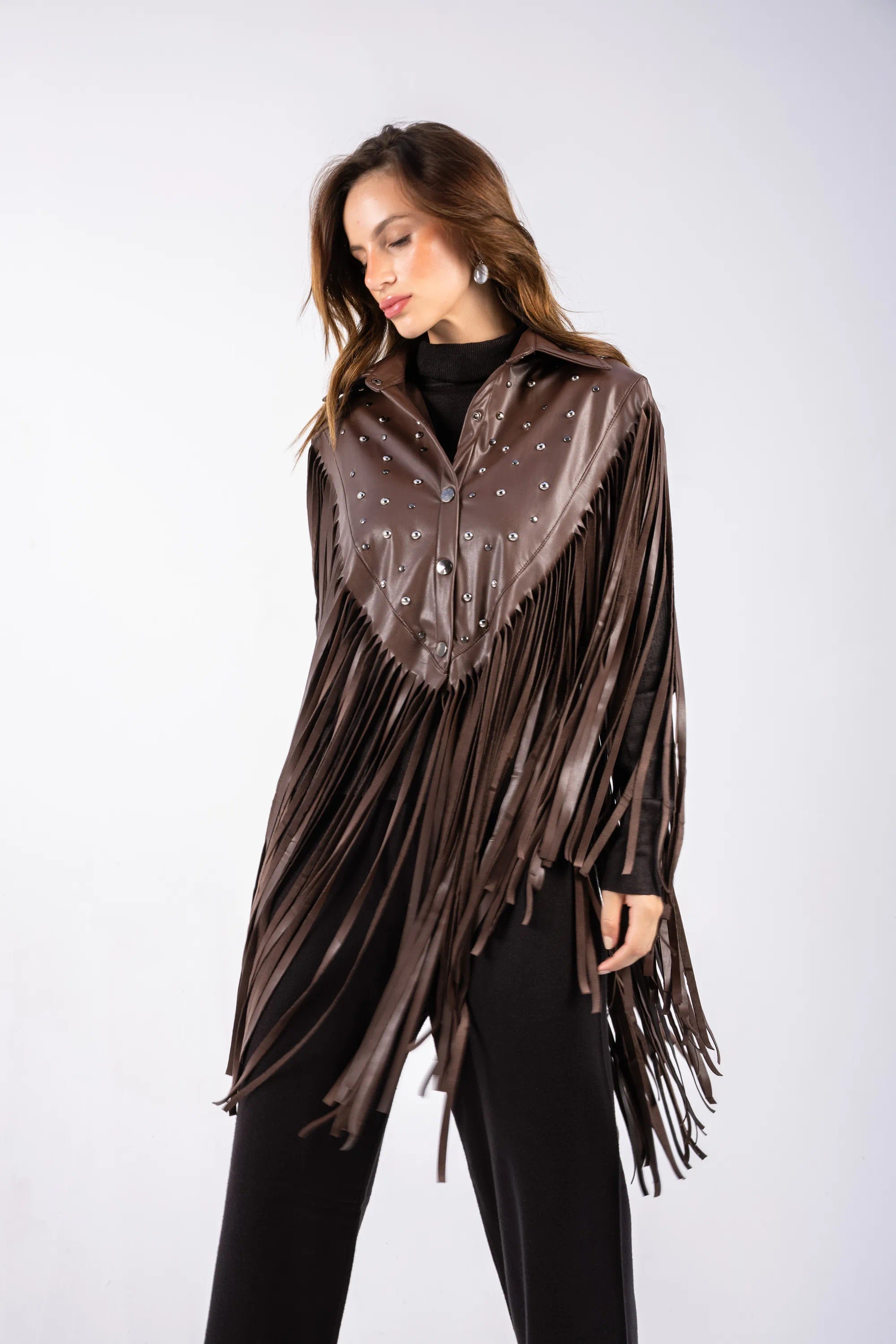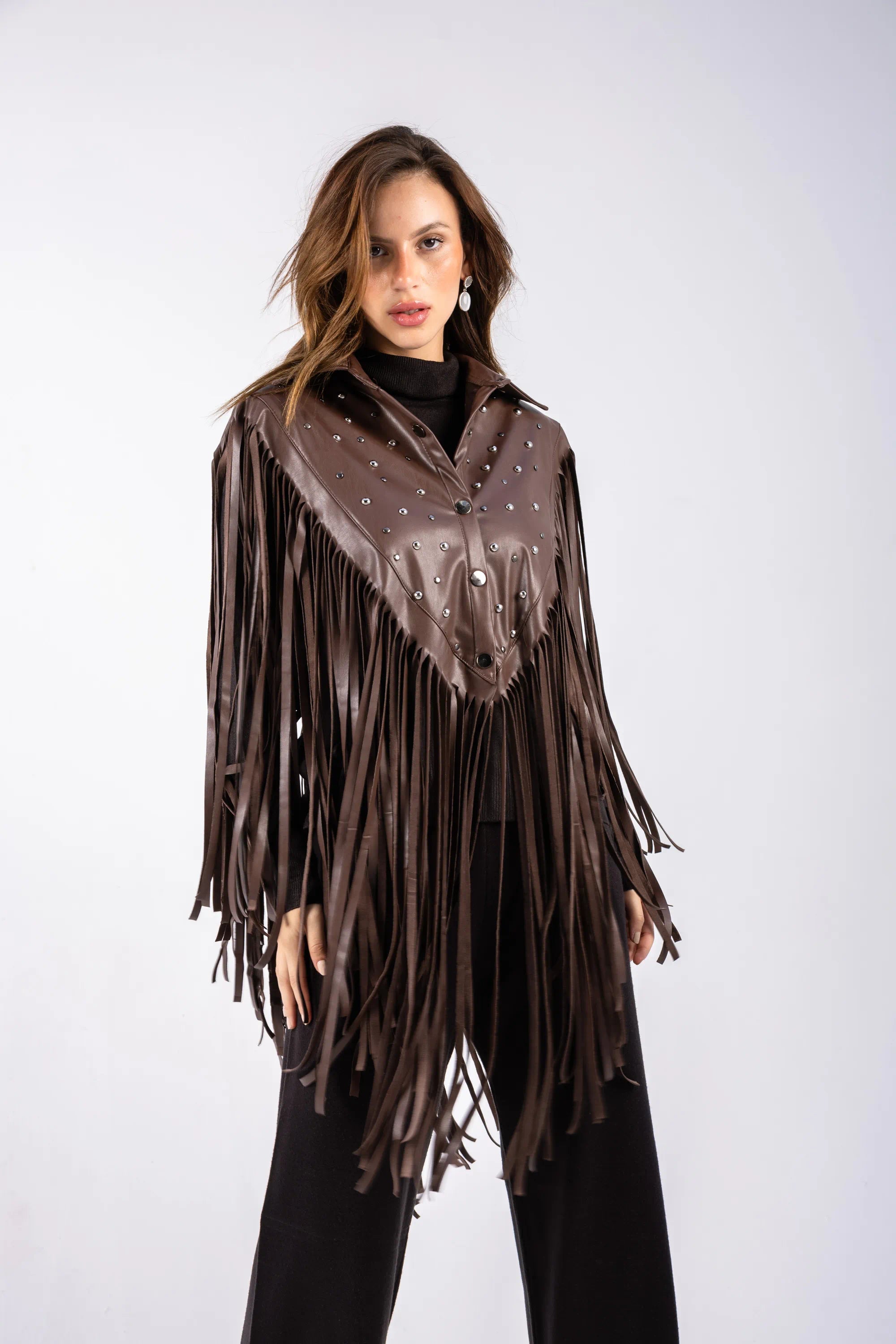 A leather scarf crafted with bold stud embellishments and cascading fringes—adding movement, structure, and a powerful statement finish. Its striking design instantly elevates any outfit, making it a standout accessory for bold, modern styling.