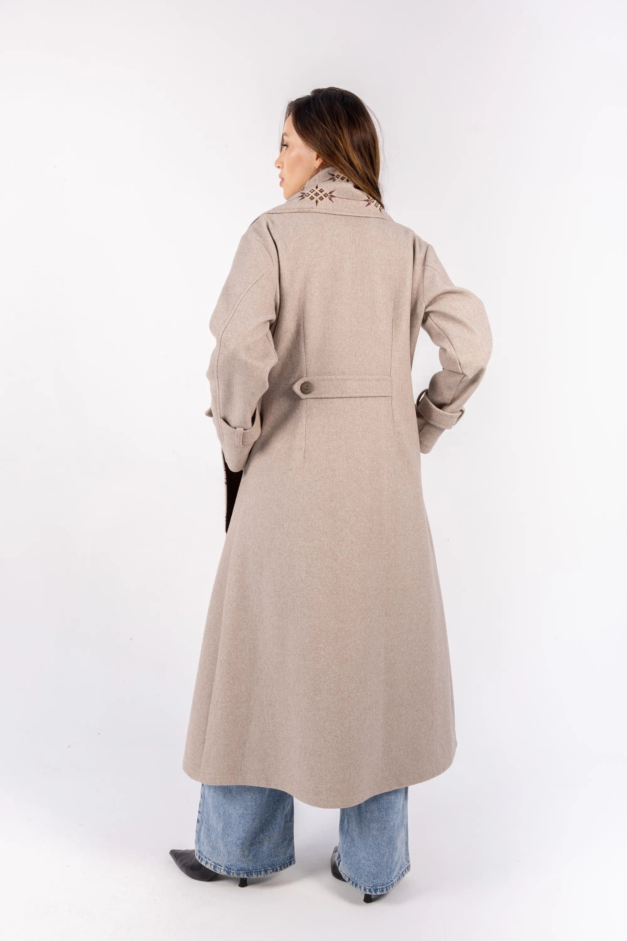 A luxurious wool coat featuring soft padded warmth, elegant embroidered detailing, and a matching scarf—crafted to bring sophistication, comfort, and a refined winter statement in one complete look. Its long silhouette adds graceful movement and polished style to any outfit.