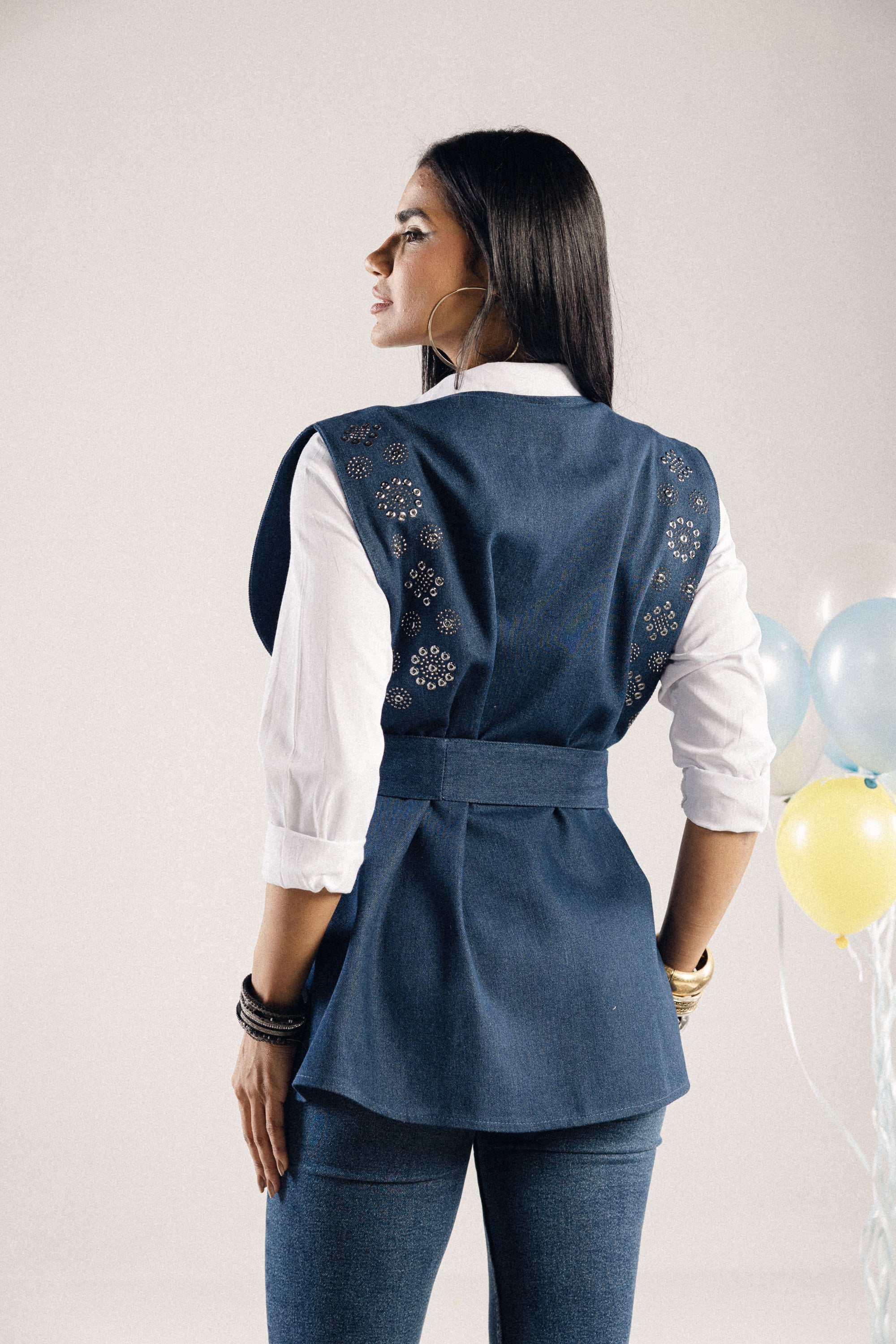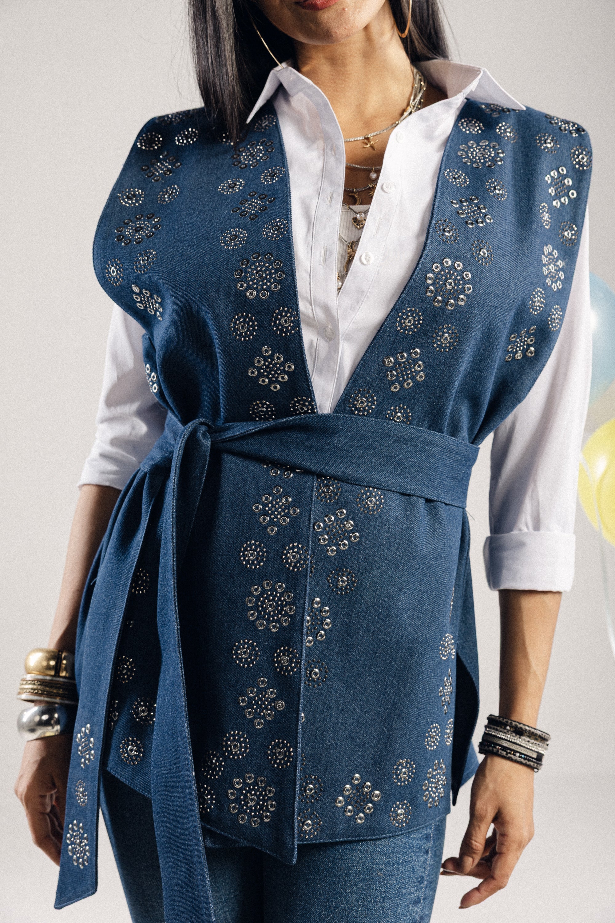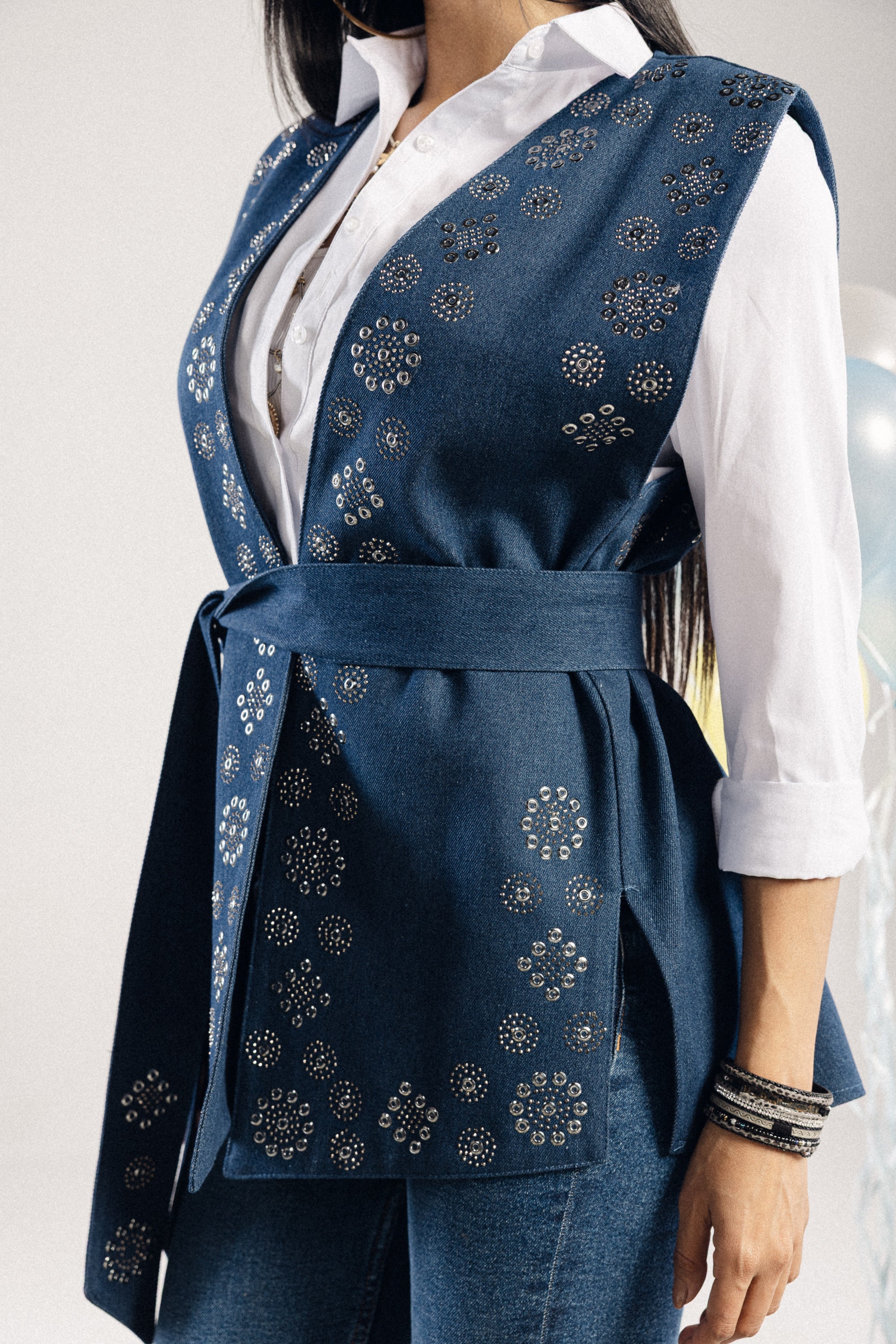 An artistic vest that radiates a sense of optimism and grace. Featuring a belted silhouette, it blends refined structure with expressive embroidery for a look that feels both soulful and elegant.