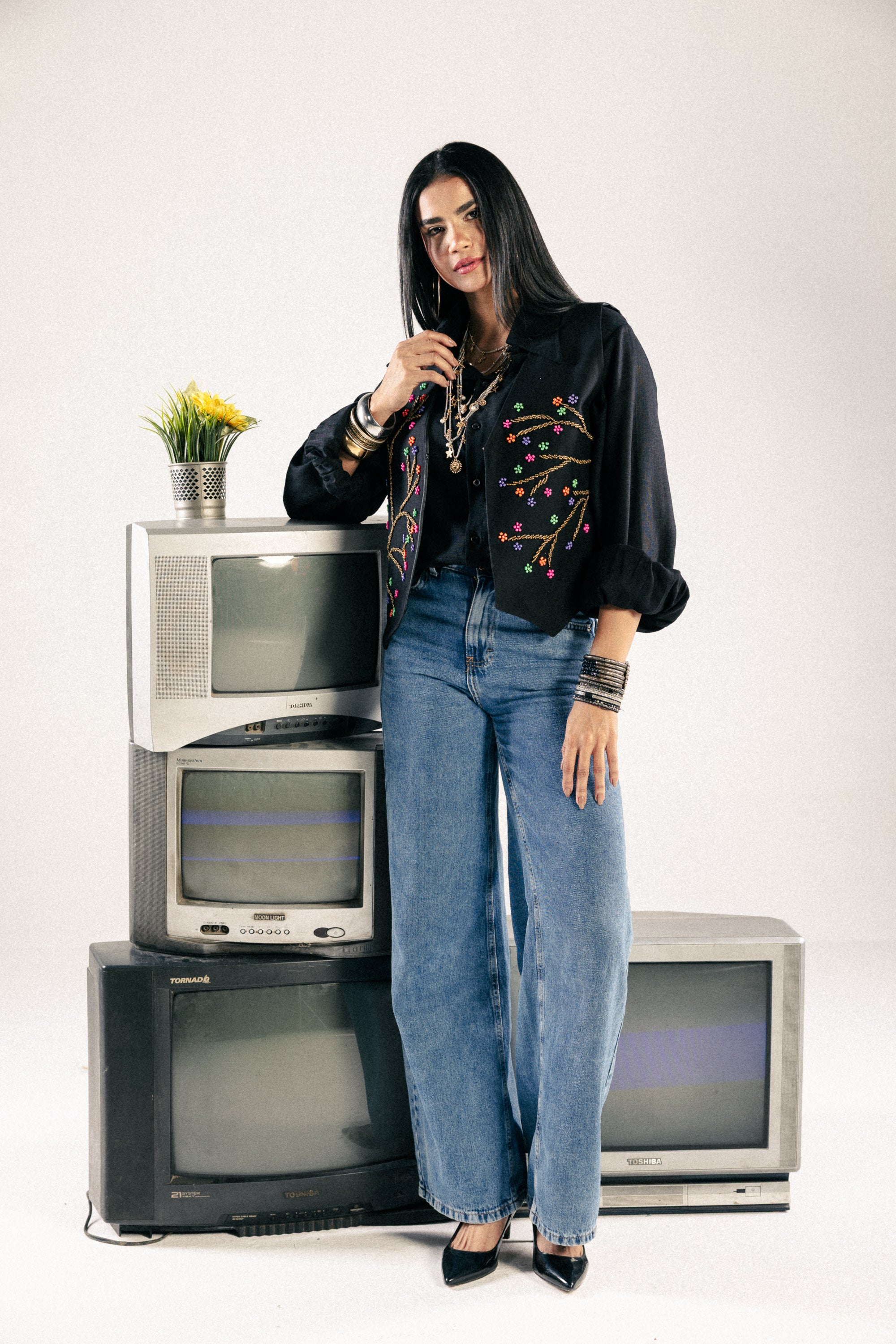 • Detailed multi-colored branch embroidery.