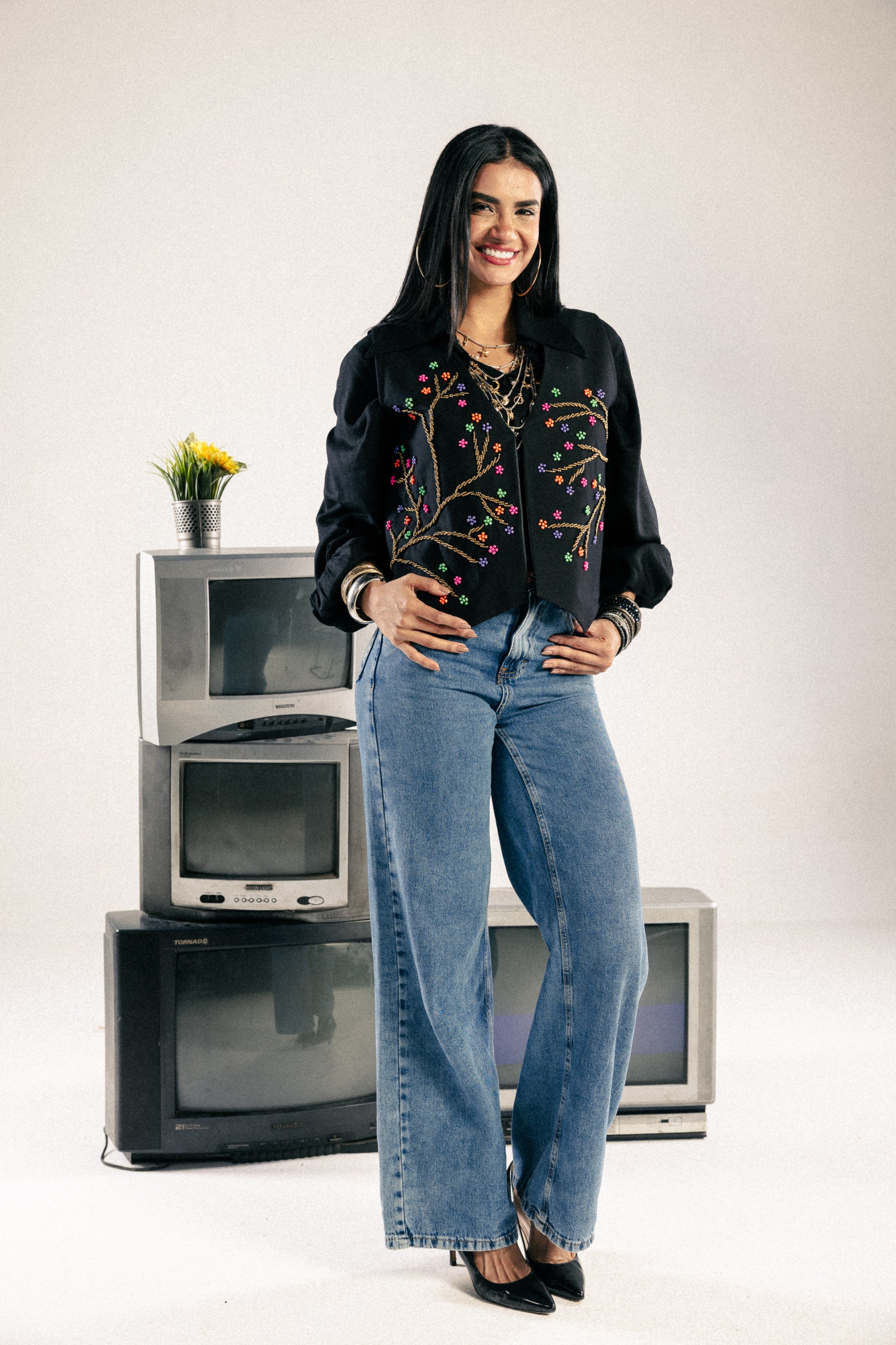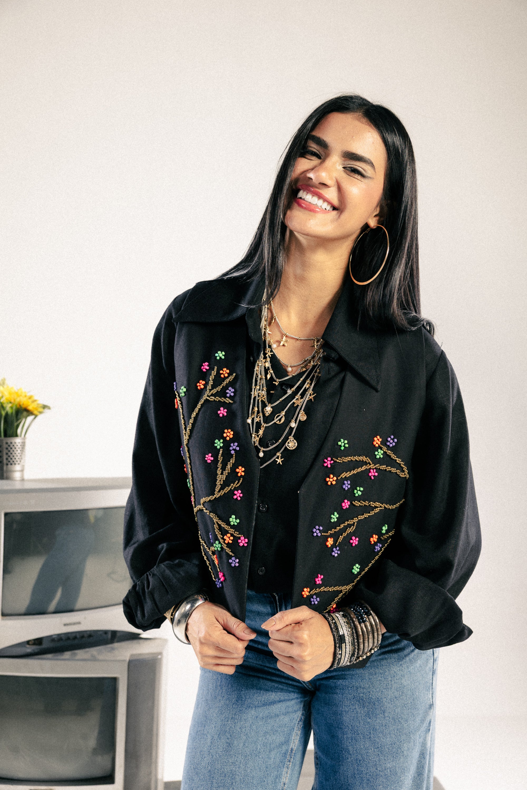 An elegant vest featuring whimsical, multi-colored branch embroidery. With its classic open-front silhouette, it offers a refined and artistic look that radiates a gentle and welcoming charm.