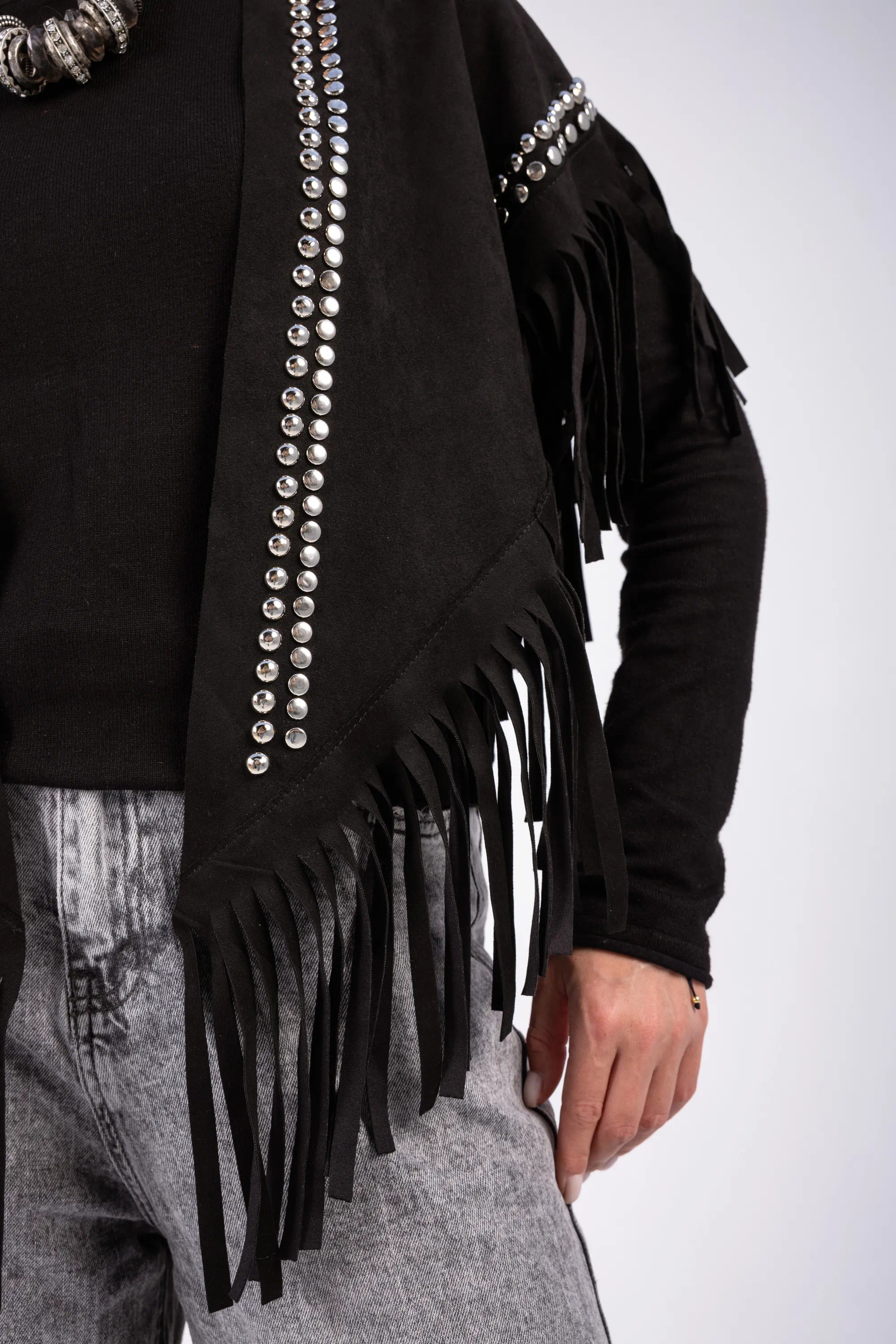 A suede scarf designed with bold stud detailing and flowing fringes—adding movement, texture, and a sharp, stylish edge to any outfit. Its free-size cut makes it easy to layer and style effortlessly.