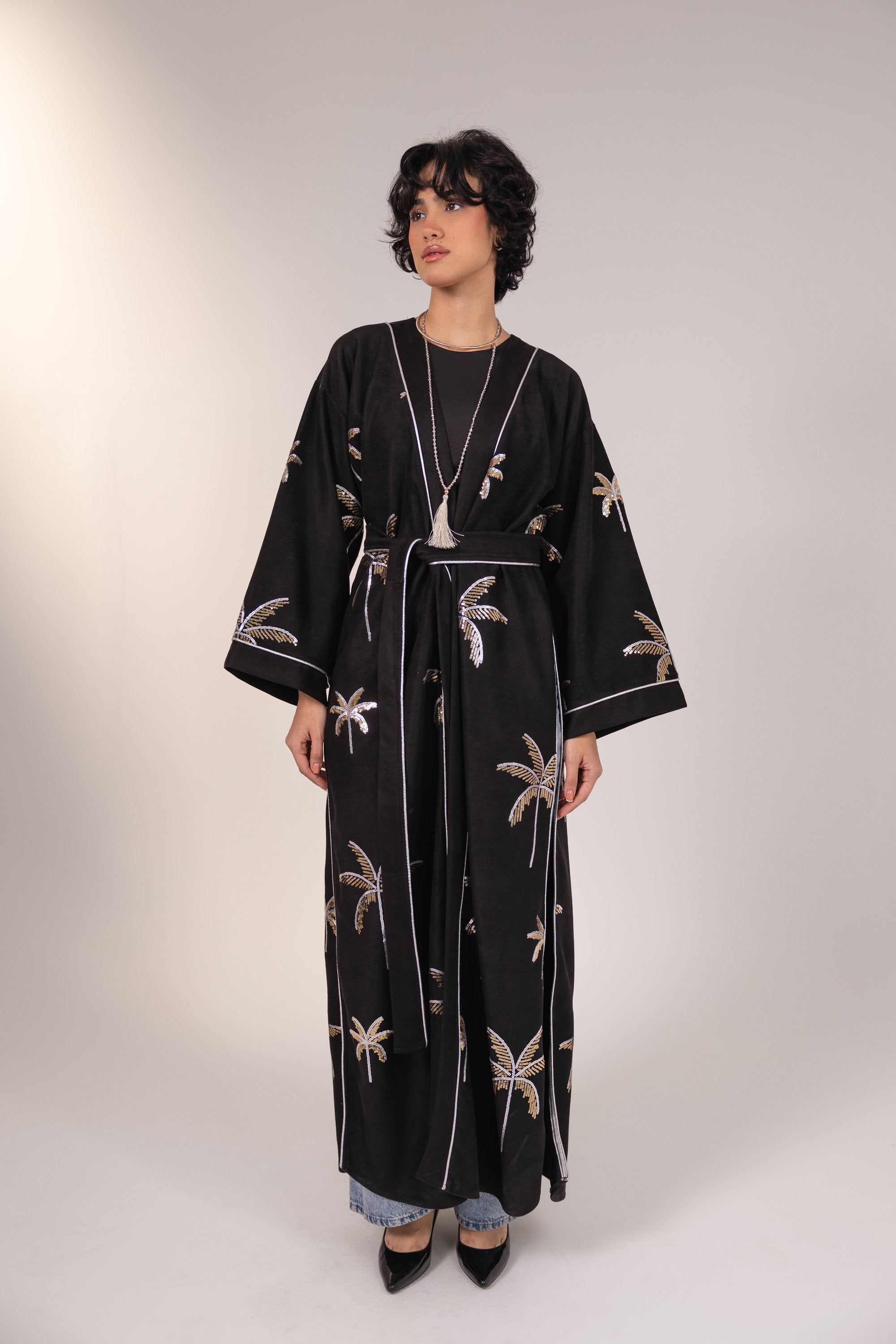 Featuring intricate embroidery, this sophisticated suede kaftan is finished with a matching belt that creates a flattering, adjustable fit. Designed to offer exceptional comfort while maintaining an elegant and polished appearance.