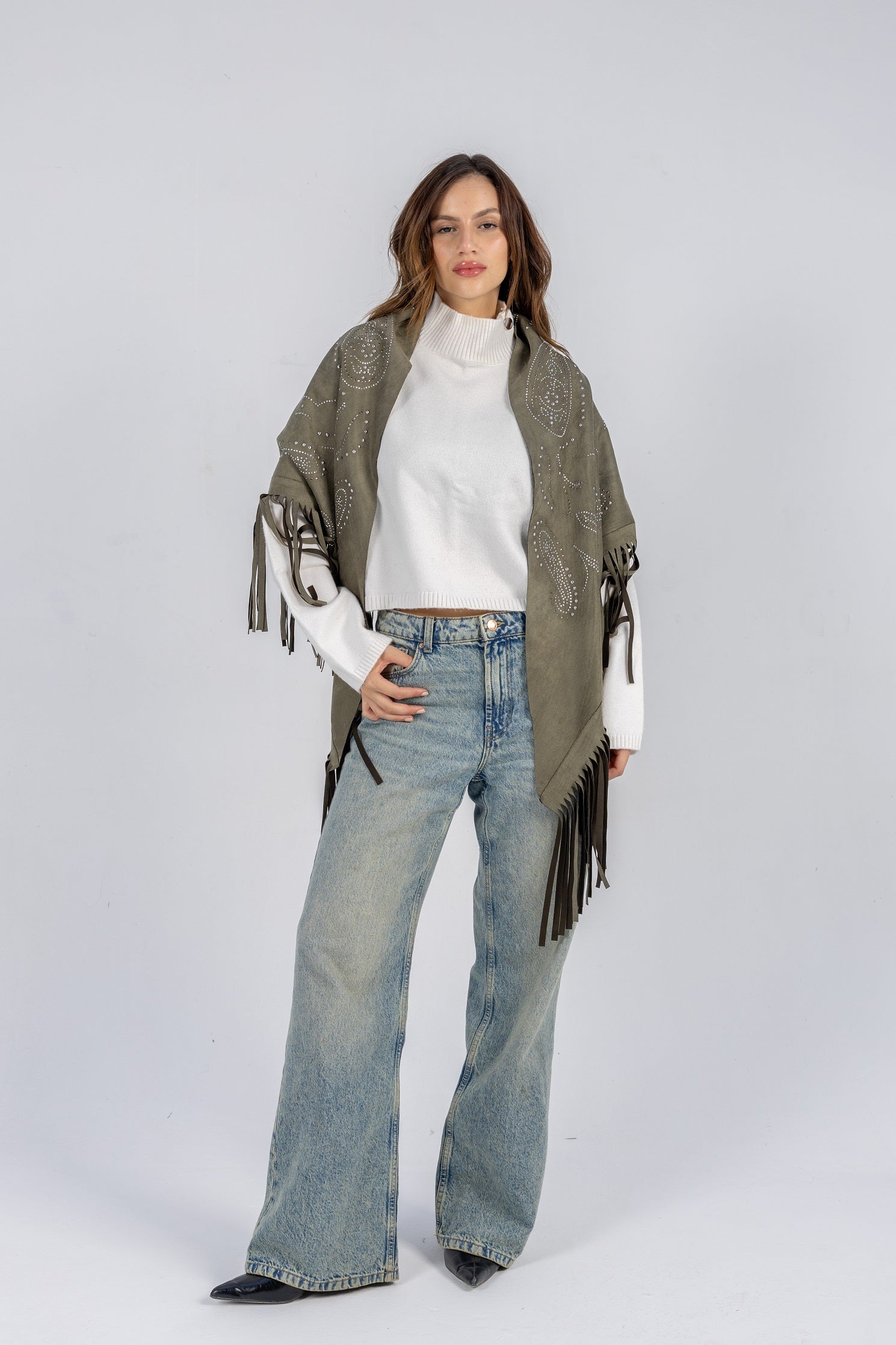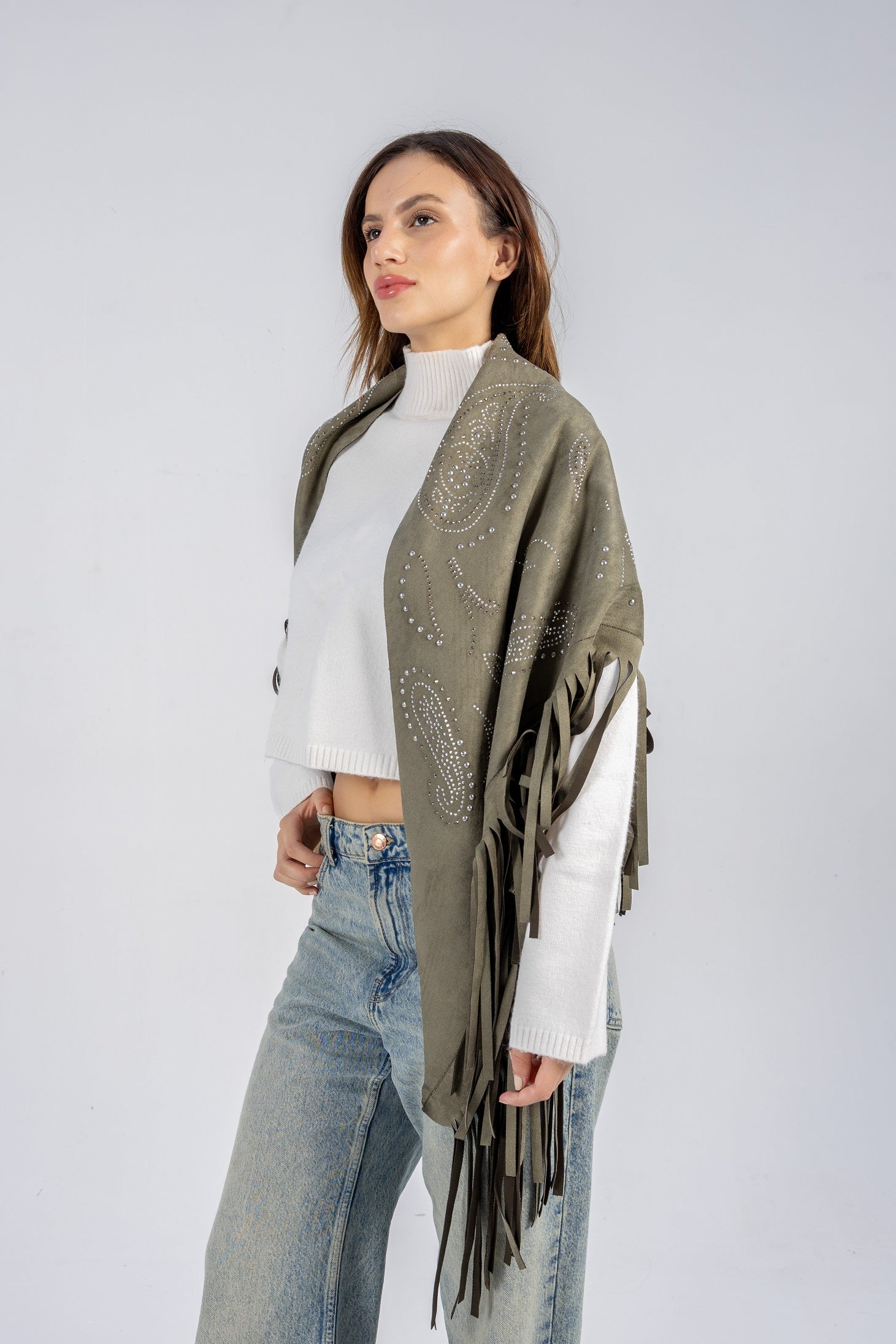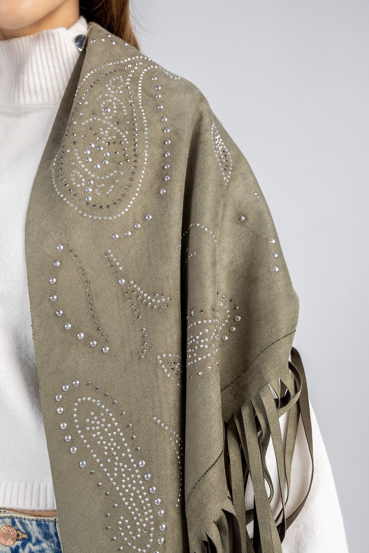 A suede triangle scarf crafted with a soft texture, flowing fringes, and subtle stud detailing. Designed to create a dynamic, layered effect, it enhances any outfit with its graceful drape and shimmering accents.