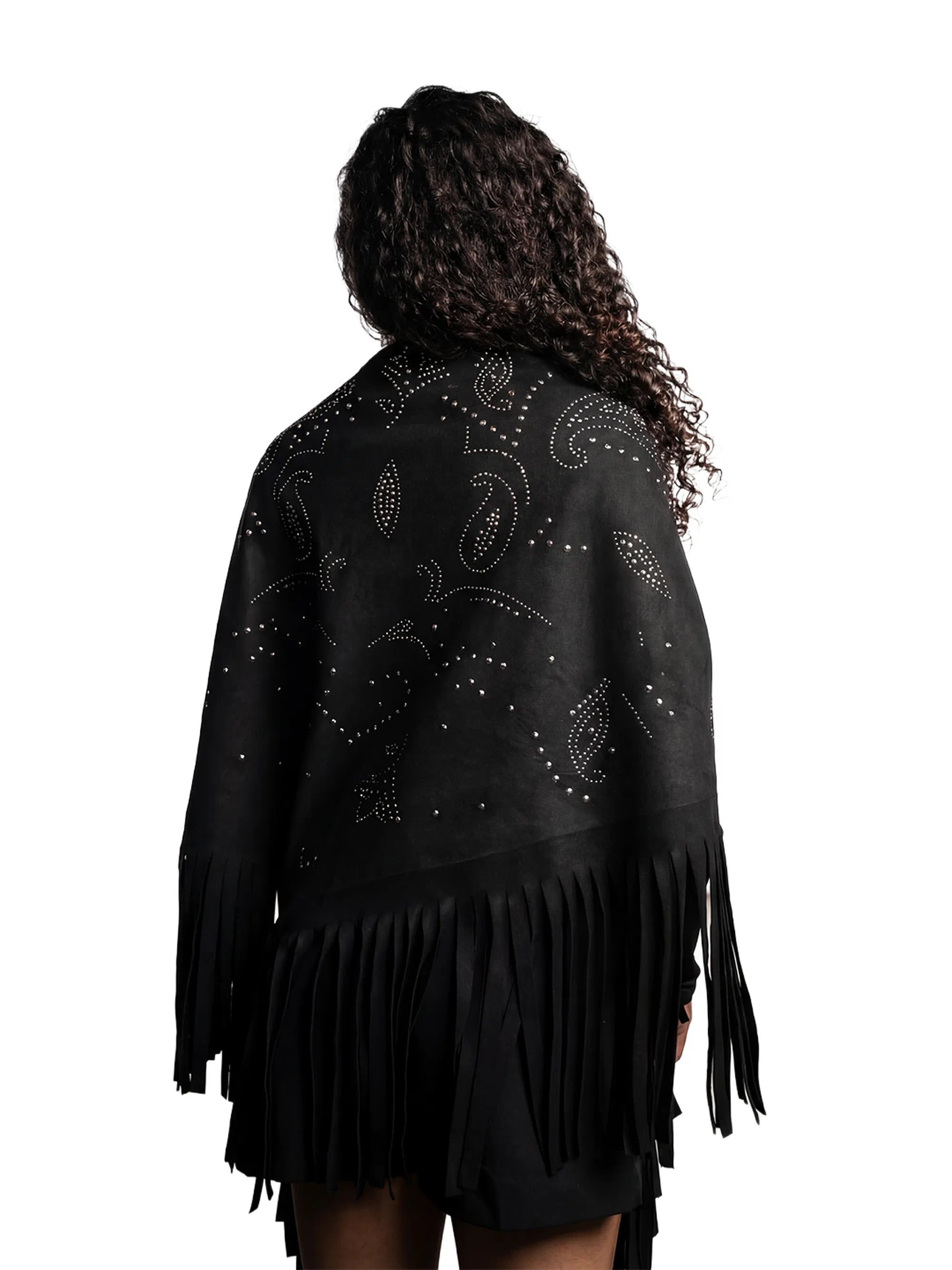 Woman in a black outfit with a fringe jacket standing in front of a vintage car.