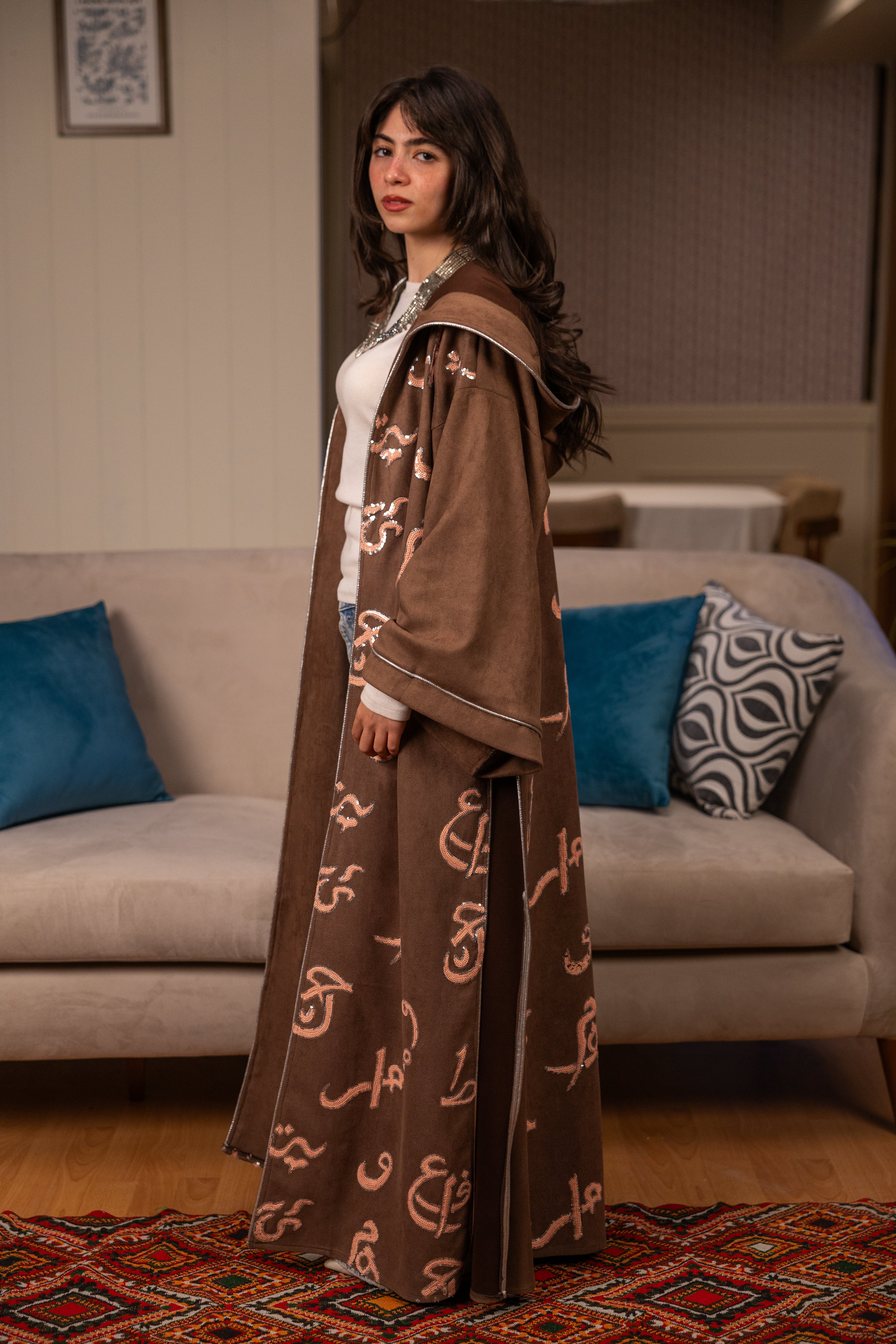 A sophisticated suede kaftan designed with a flowing, elegant silhouette, highlighted by embroidered Arabic letter detailing and finished with a matching belt for a flattering, adjustable fit. Crafted to offer all-day comfort while maintaining a refined, polished look.