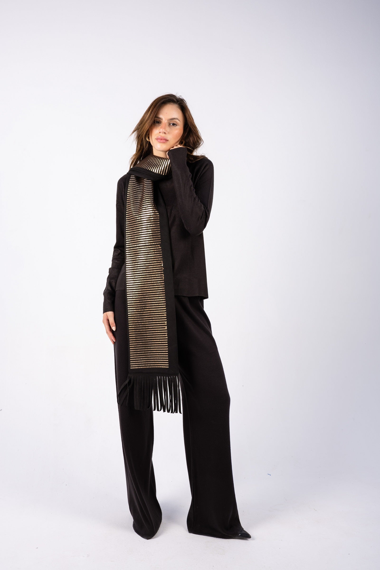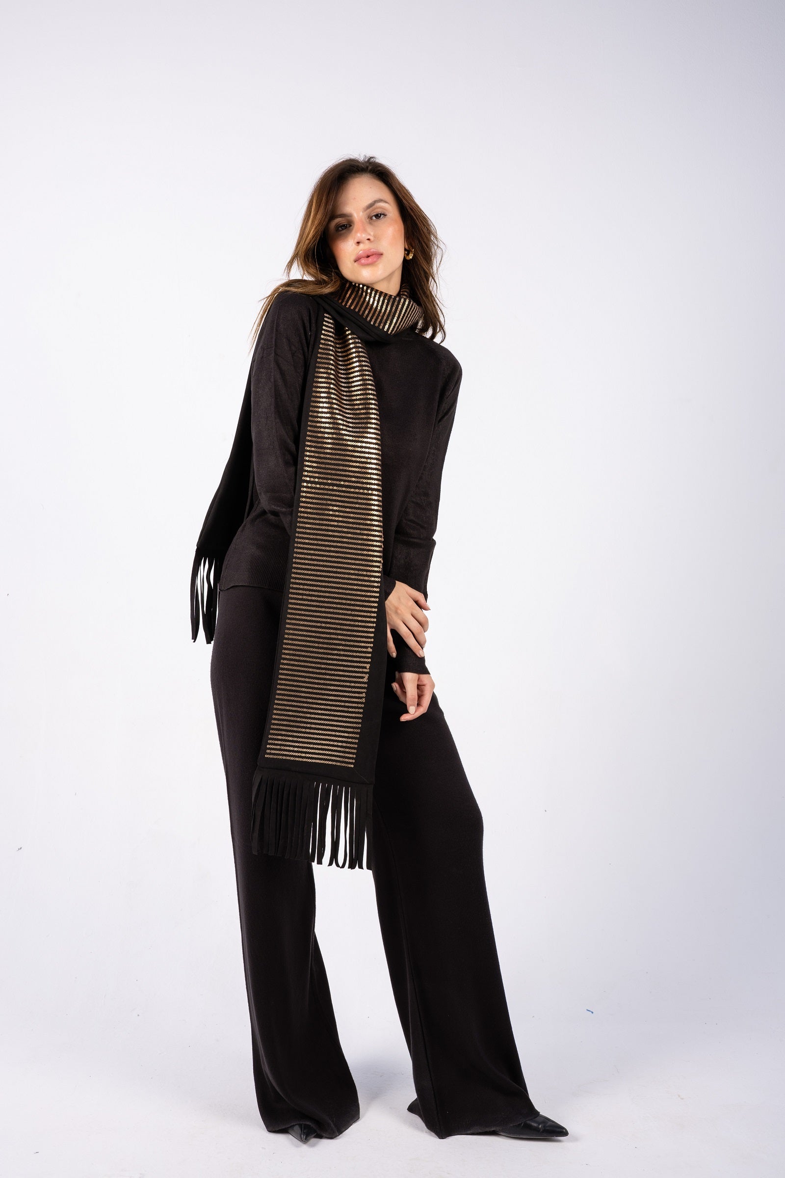 A sleek suede scarf adorned with shimmering sequins and finished with soft fringes—designed to add refined sparkle and graceful movement to any outfit. Its long, easy-to-style silhouette makes it a standout accessory for every occasion.