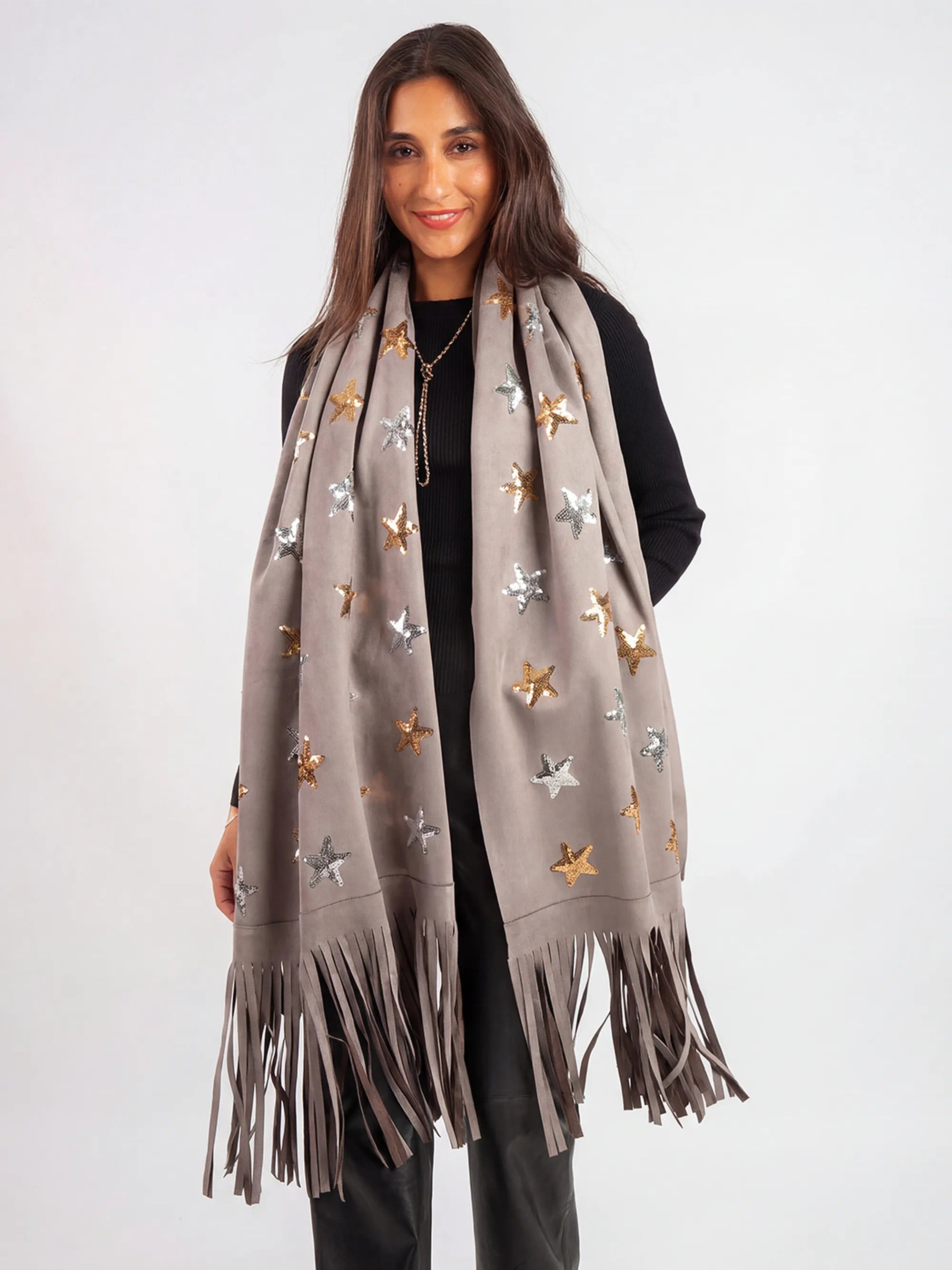 Woman wearing a gray scarf with star patterns and fringes on a white background