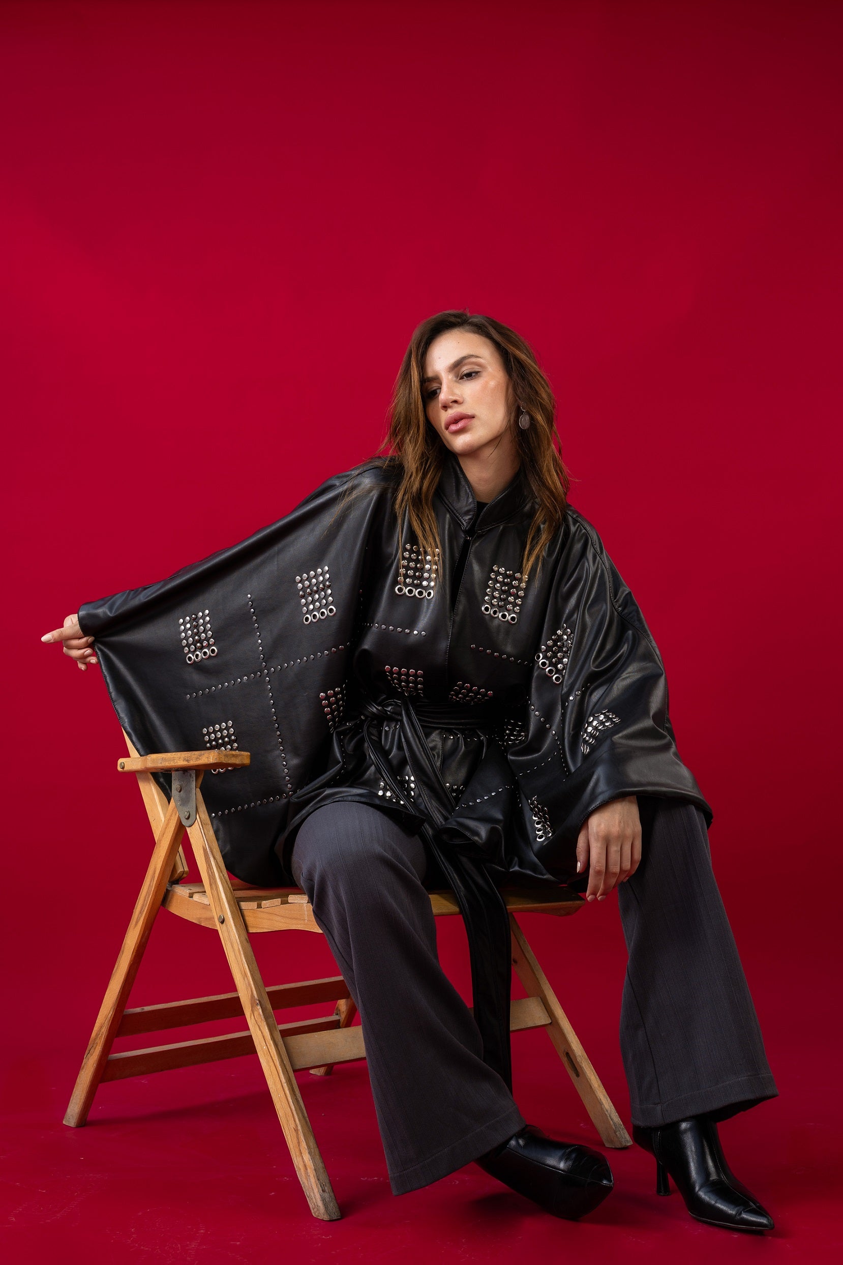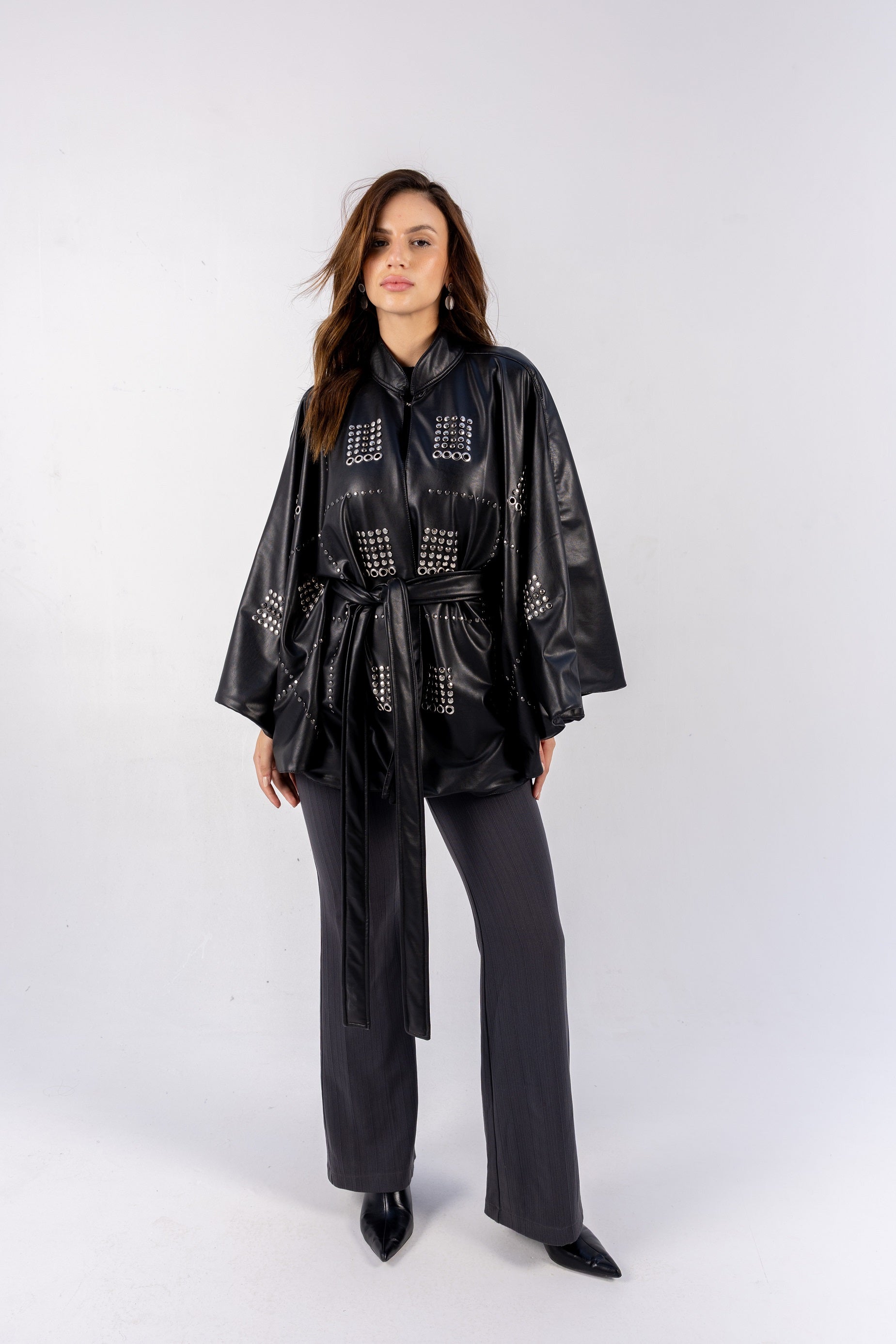 A sleek leather-finish jacket with a soft padded feel, elevated by bold stud detailing and a flattering waist belt. Designed to bring structure, edge, and a sculpted silhouette—all in one easy, stylish layer.